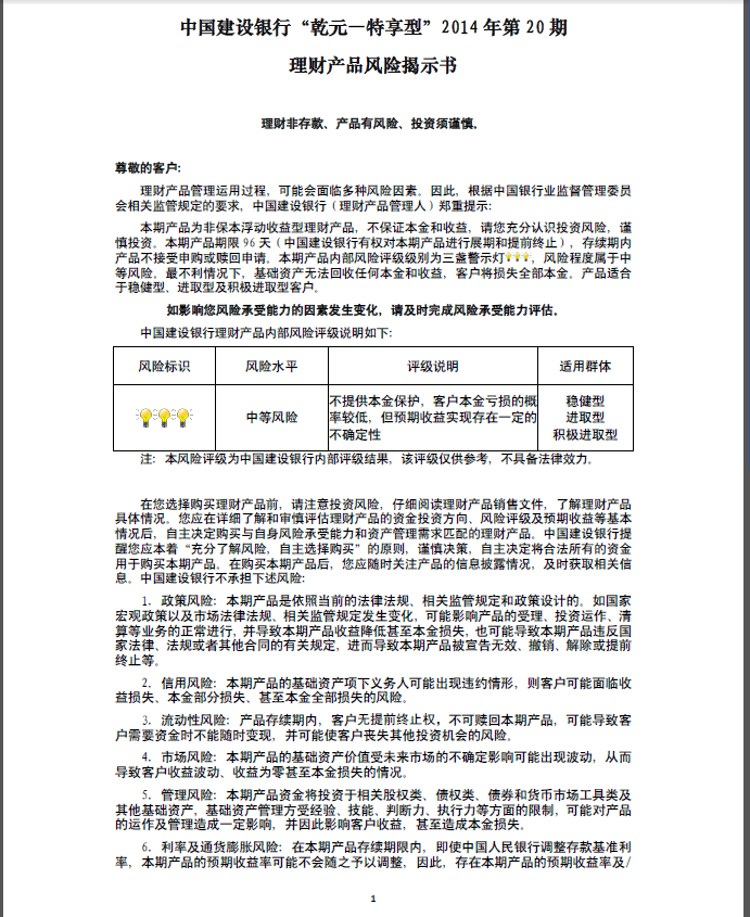 “乾元—特享型”2014年第20期理财产品风险揭示书及产品说明书(苏州)